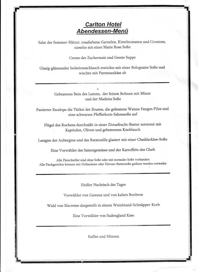 Im Hotel Carlton an der Englischen Riviera war man bemüht. Die Übersetzungsprogramme steckten jedoch noch in den Kinderschuhen, das Ergebnis wurde legendär. Ein Gast sah sich gezwungen, die Weichheit des Teppichbodens im Speisesaal auszutesten, weil es ihn nicht mehr in seinem Stuhl hielt.